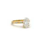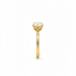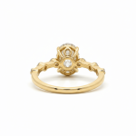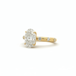 The elongated oval silhouette enhances finger length and creates graceful presence, while the accent diamonds add refined brilliance without overpowering the center stone. The warmth of yellow gold beautifully enhances the diamond’s brightness, giving the piece rich and timeless appeal.