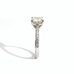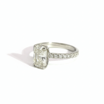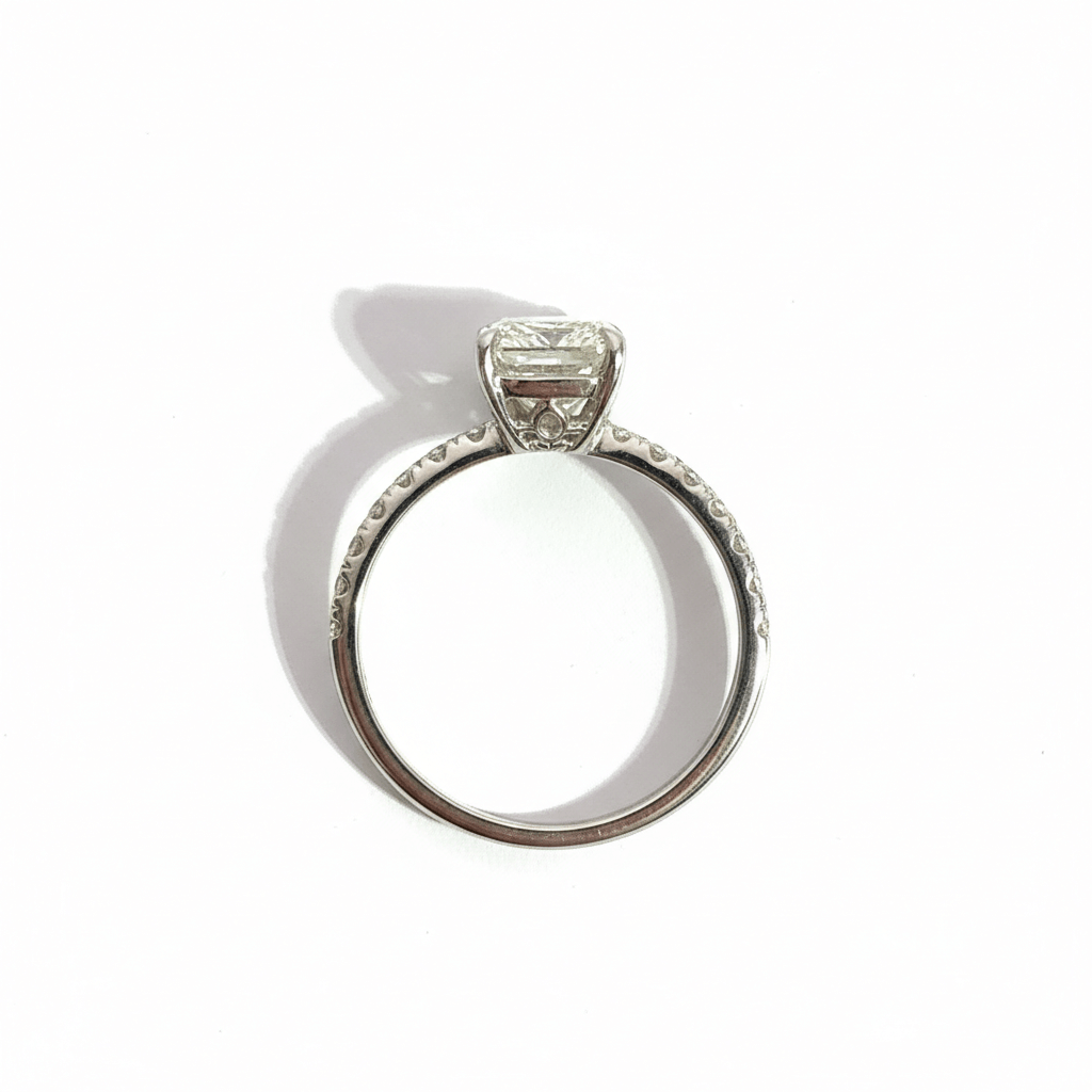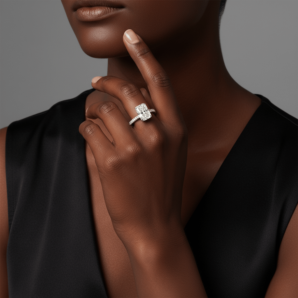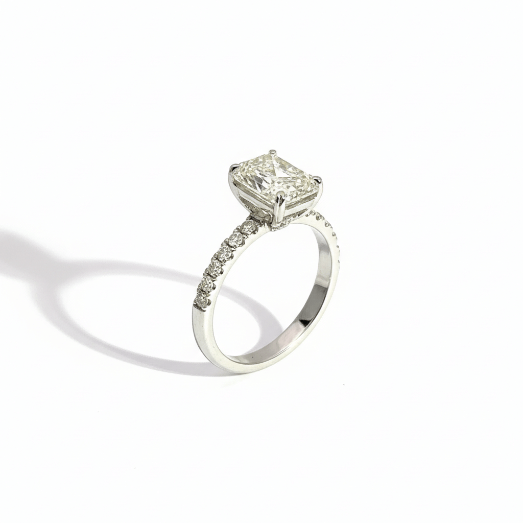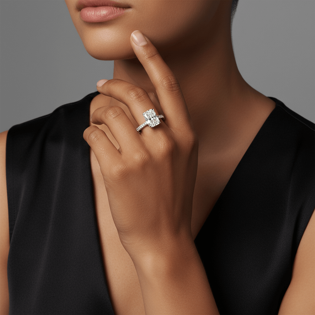 The radiant cut combines structured elegance with brilliant faceting, creating strong light performance and impressive finger coverage. The accent diamonds enhance overall brilliance while maintaining a clean, modern silhouette.